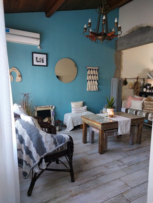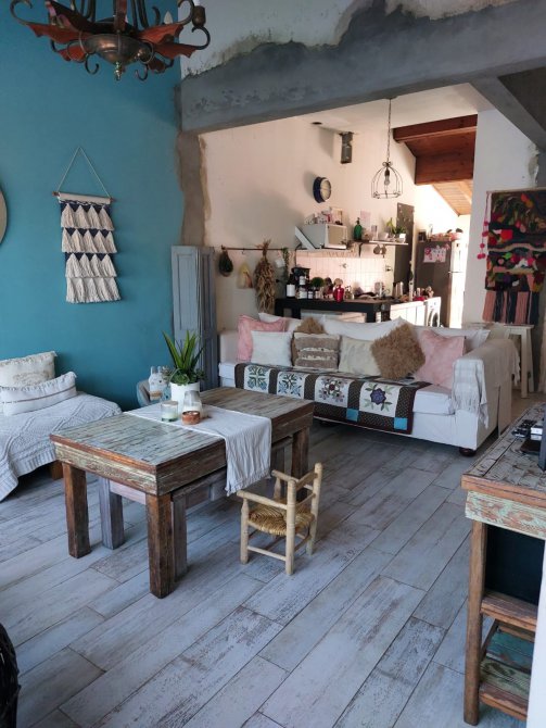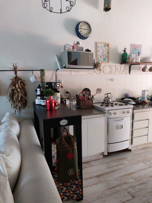 Cocina con mesada y muebles bajo mesada, living comedor amplio.